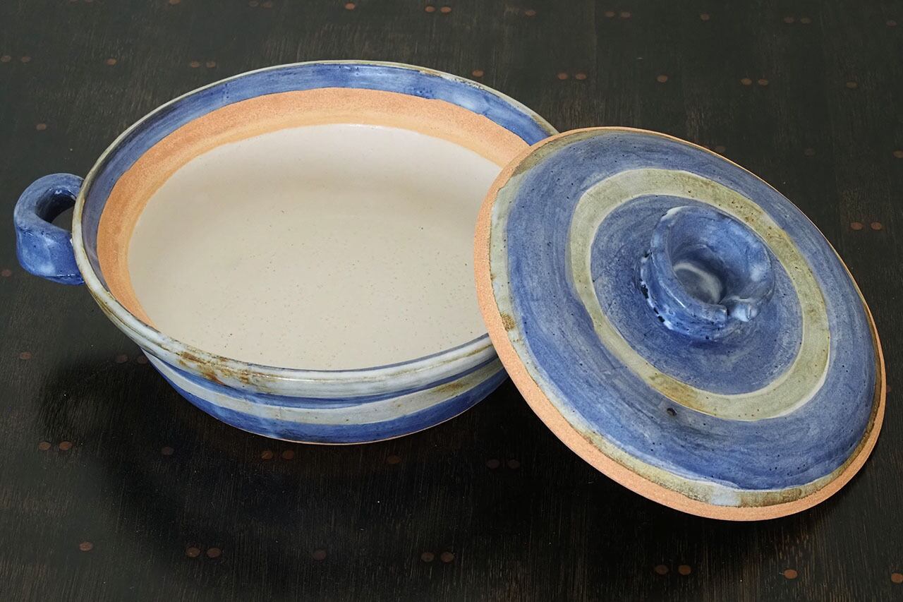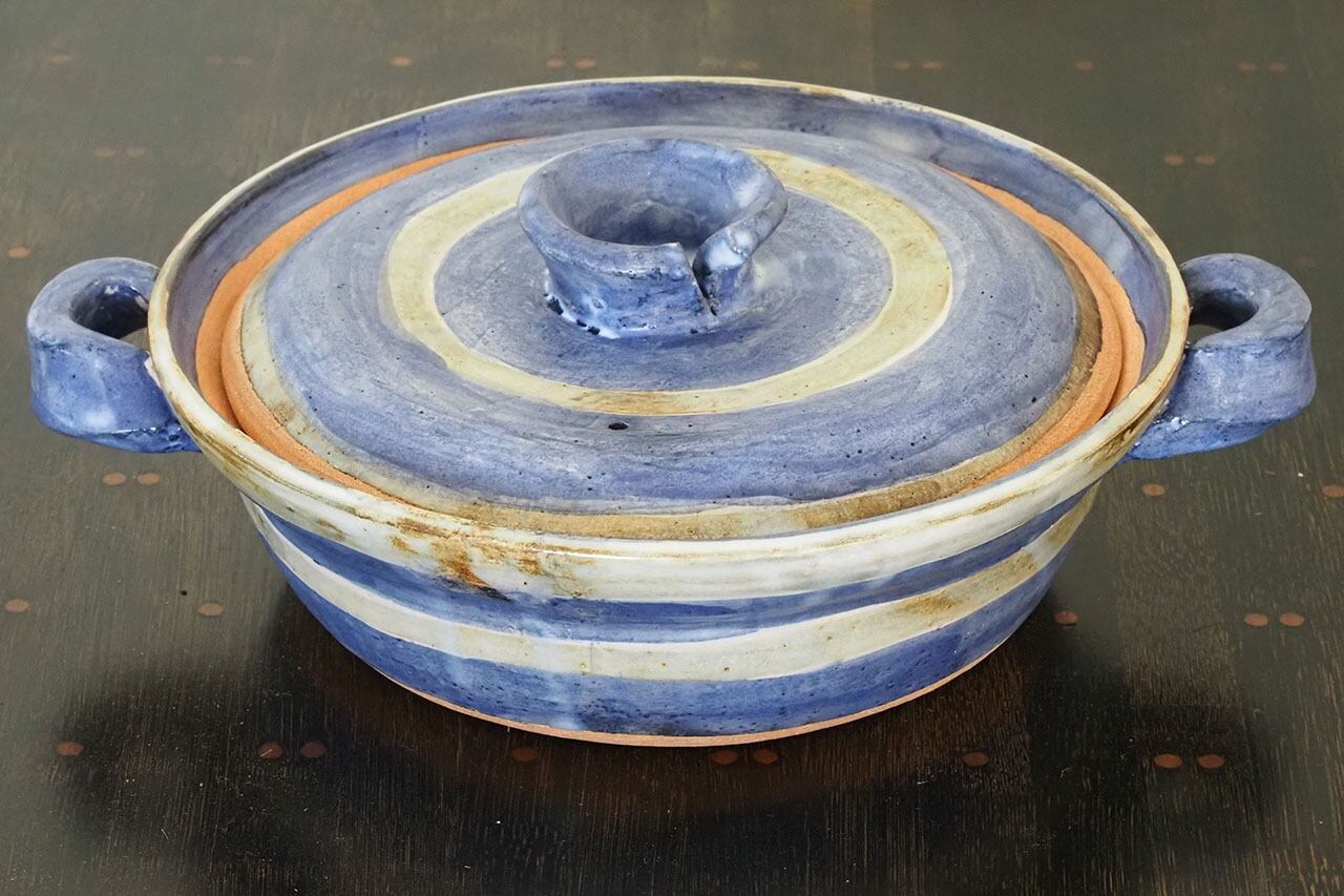 土鍋 白土白釉 呉須と鬼板のストライプ 4-1